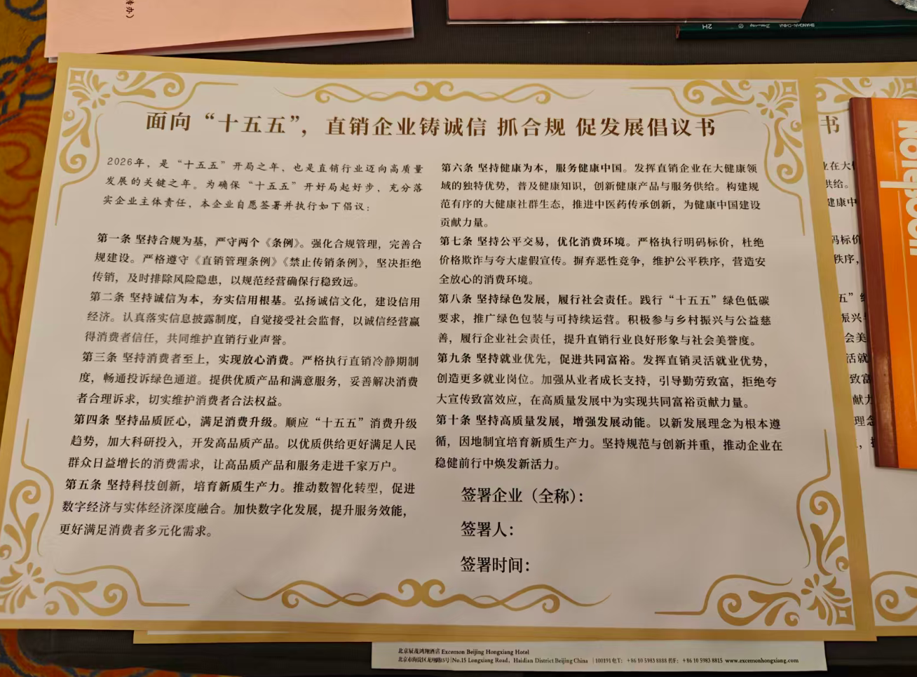 会议期间,九极公司与所有与会直销企业代表共同签署了《面向“十五五”:直销企业铸诚信 抓合规 促发展倡议书》,承诺将严格遵守法律法规,加强行业自律,共同维护直销市场的健康秩序。
